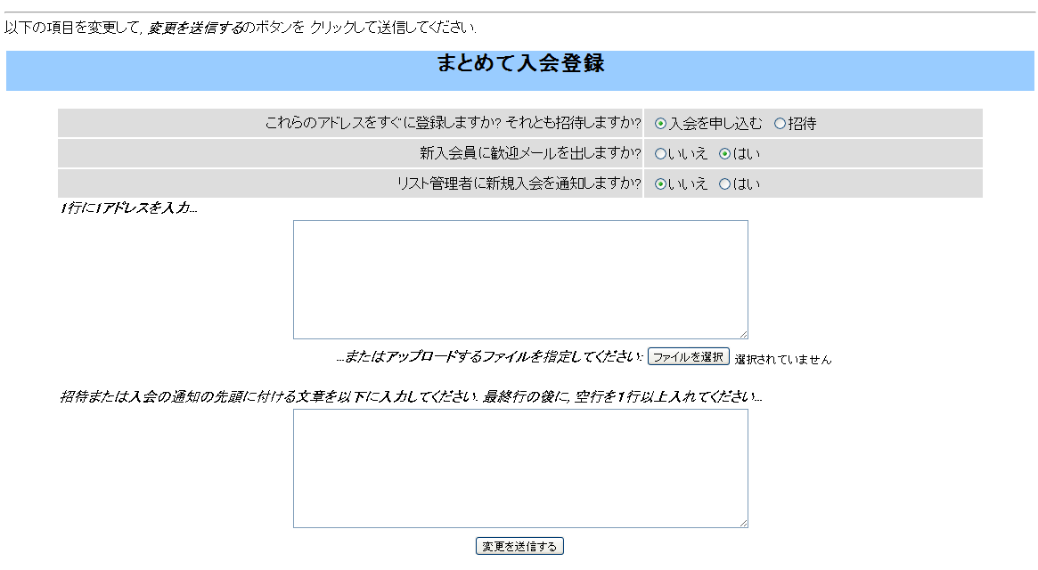 • 入会を申し込む」 → ユーザーの承認を経ずに、メーリングリストに追加します。