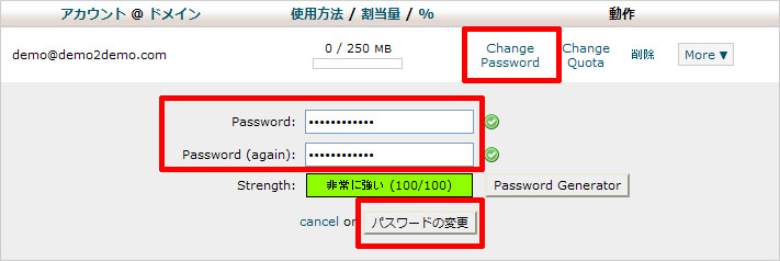 変更するメールアドレスの「Change Password」をクリックするとパスワードの再設定フォームが表示されます。