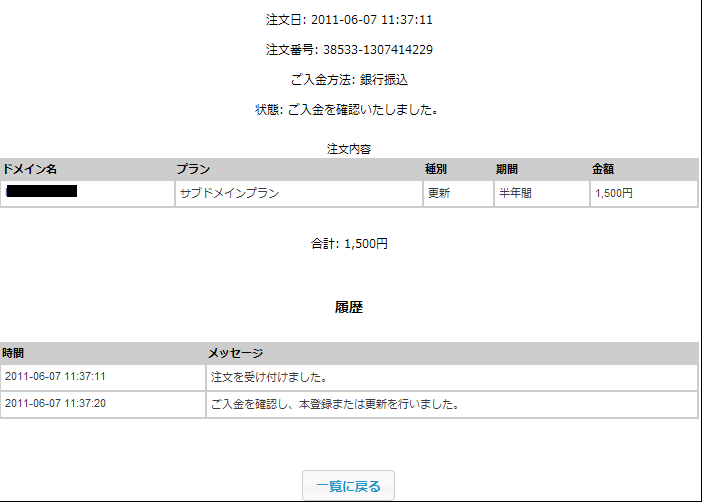 注文番号」をクリックすると該当の注文番号の詳細が表示されます。
