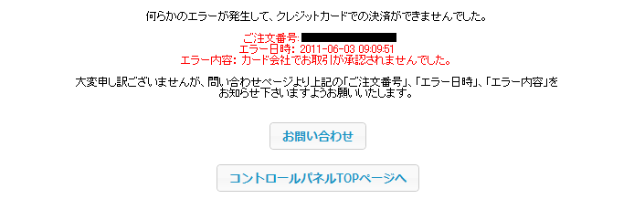 何らかの原因でクレジットカード会社からの承認が降りなかった場合、以下の画像のようにエラー内容が表示されます。