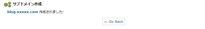 xxxが作成されました」と表示されますので、以上でサブドメインは作成されました。