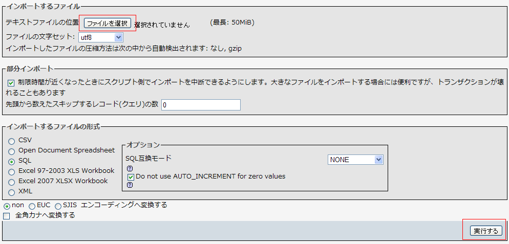 ページ下部の「実行する」をクリックしますと、SQLファイルがアップロードされ、データのインポートを開始します。