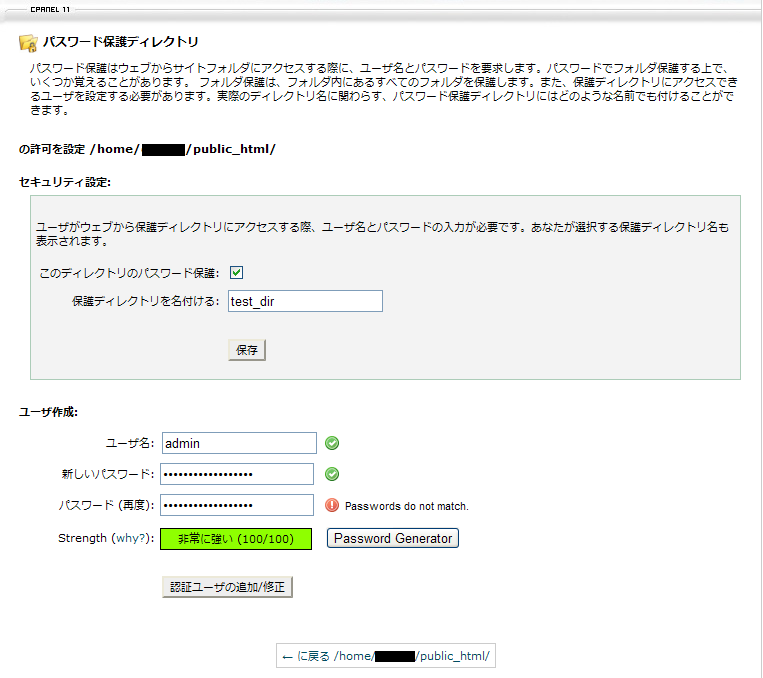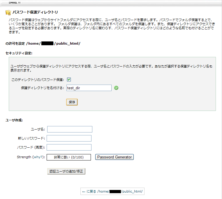 認証の設定が完了すると、再度パスワード保護ディレクトリの設定画面が表示されます。