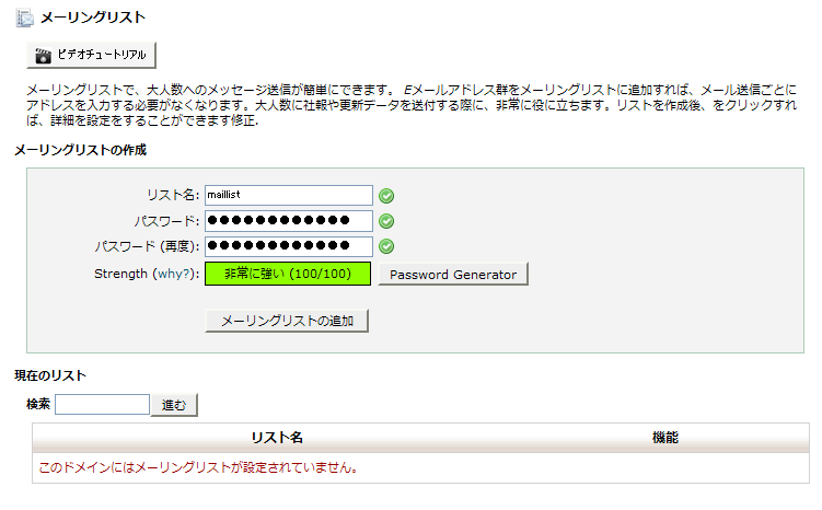 メーリングリストの追加」をクリックしますとメーリングリストが作成されます。