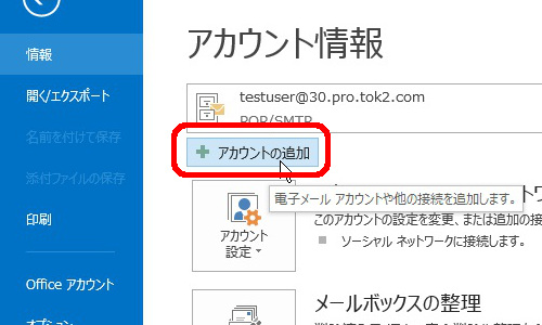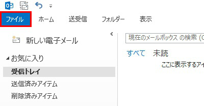「Outlook 2013」を起動し「ツール」 メニューの 「ファイル」タブをクリックします。