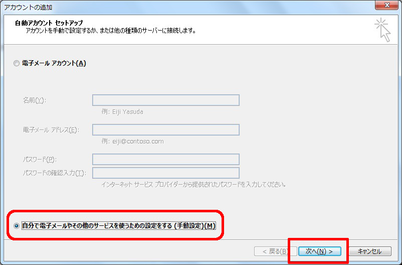 「自動アカウント セットアップ」の画面が表示されましたら、「自分で電子メールやその他のサービスを使うための設定をする(手動設定)(M)」にチェックを入れ、「次へ」をクリックします。