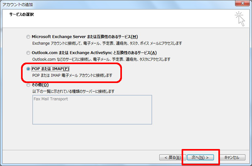 「サービスの選択」画面が表示されましたら、「POP または IMAP(P)」を選択して、「次へ」をクリックします。