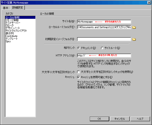 「ローカルルートフォルダ」は、作成したホームページを保存している場所を指定してください。