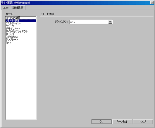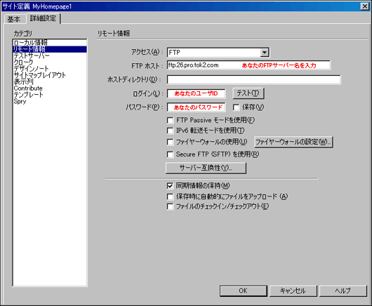 サイト定義」ダイアログが開きますので各項目をご入力下さい。