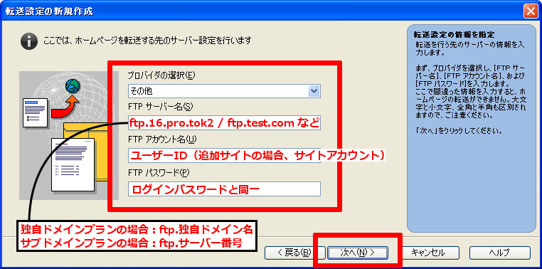 お客様の「ユーザーID」「パスワード」「FTPサーバー名」をご用意下さい。