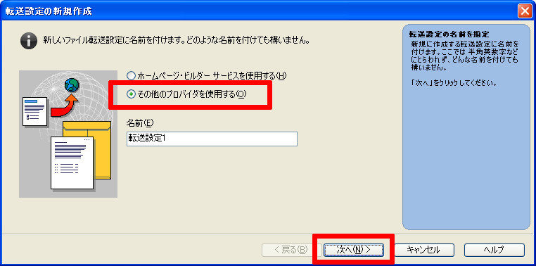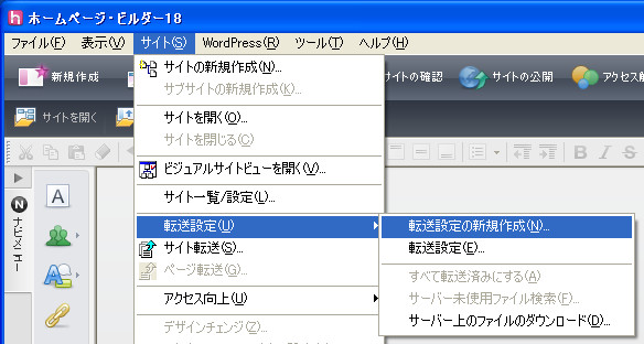 ホームページビルダーのツールバーで「サイト」 → 「転送設定」 → 「転送設定の新規作成」をクリックします。