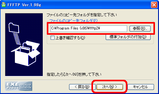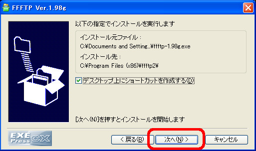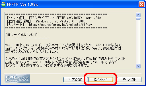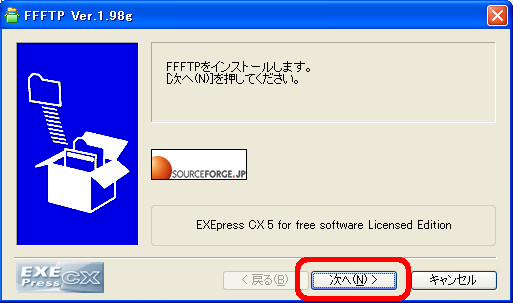[ffftp-1.98g.exe]を実行 するとインストーラーが立ち上がりますので「