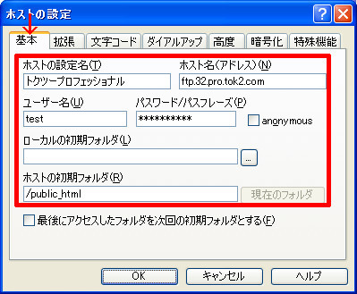 | ホスト名(アドレス) | お客様の「FTPホスト名」を入力してください。