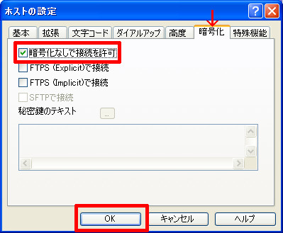 「FTPSで接続」にチェックが入っている場合は、外してください。